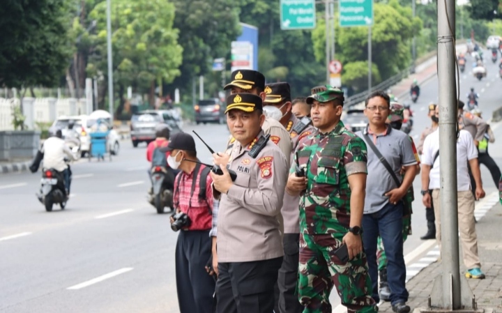 JAKARTA I Kapolres Metro Jakarta Barat Kombes Pol Pasma Royce bersama dengan Dandim 0503 JB Kolonel Kav I Made Maha Yudhiksa melaksanakan pengamanan sekaligus pengawalan terhadap massa yang melintas di sekitar Traffic Light Slipi Jakarta Barat, Selasa, 6/9/2022.