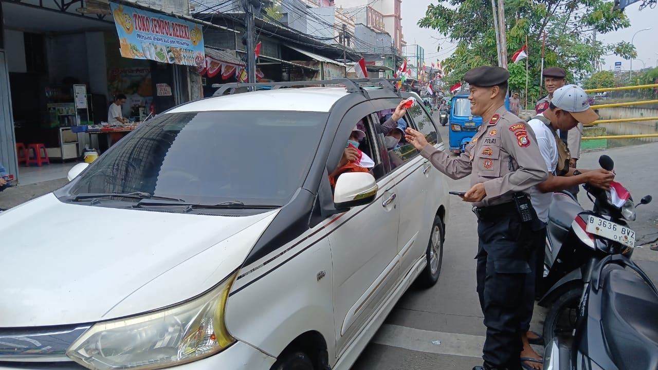 Polsek Tambora Polres Metro Jakarta Barat Bagikan Bendera Merah Putih Kepada Masyarakat Songsong Hari Kemerdekaan Republik Indonesia ke-80