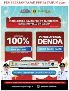 Mulai 1 September hingga 31 Desember 2025, masyarakat dapat memanfaatkan diskon 100% untuk PBB P2 tahun pajak 1994 hingga 2011, melunasi PBB P2 tahun 2025. Untuk untuk wajib pajak yang nilai ketetapan pajaknya maksimal Rp. 100.000,- Pemerintah Kabupaten Bogor memberikan pembebasan penuh: pajak dianggap langsung lunas untuk tahun 2025 tanpa perlu melakukan pembayaran lagi dan kebijakan ini berlaku tanpa batas waktu.